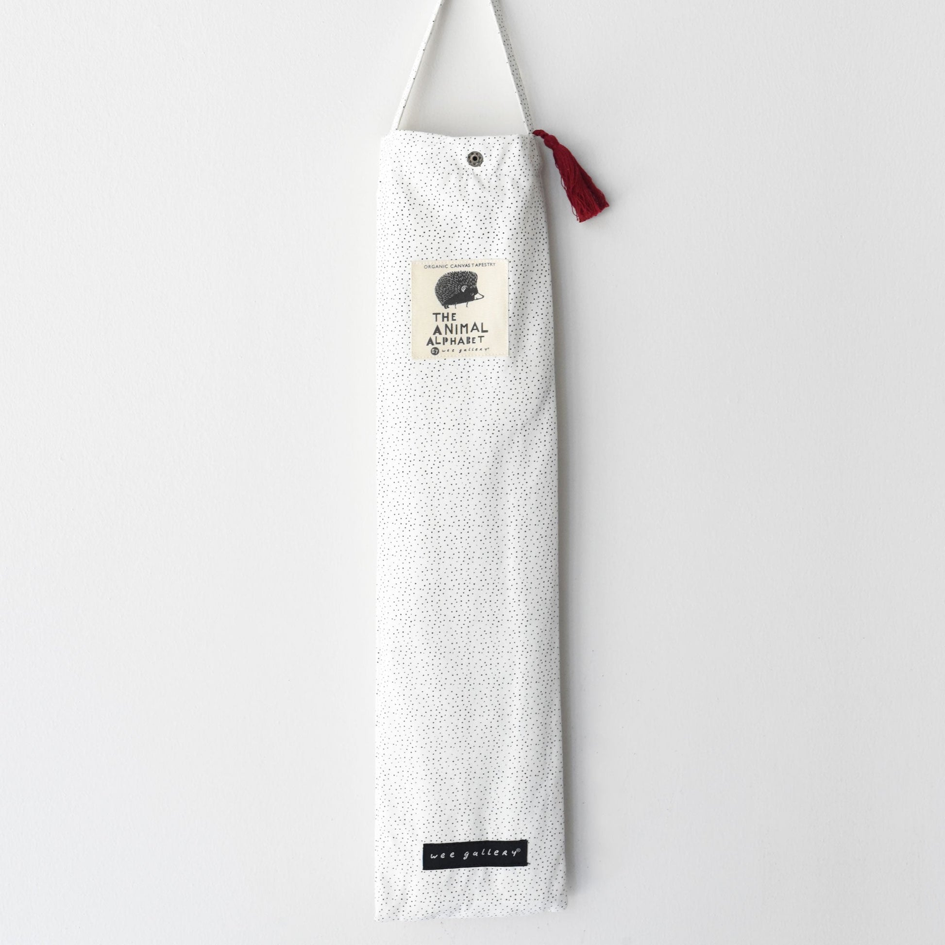 Made of: 100% Organic cotton canvas Waxed cotton twine Wooden hanging dowel Measures: 32 inches x 20 inches Care