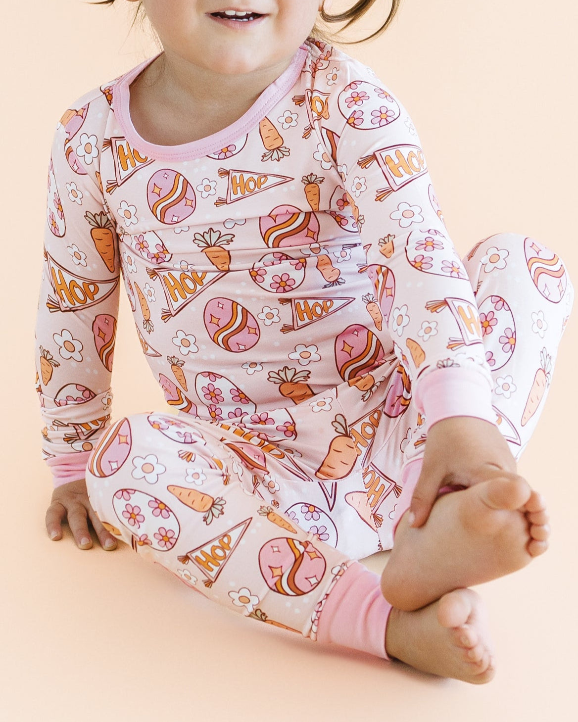 Designed with vibrant florals, playful eggs, + fun carrots, this set captures the joy + cheer of the season. Crafted from a premium blend of 95% bamboo viscose + 5% spandex, it offers an ultra-soft, stretchy feel that will keep your little one comfortable all day long. Perfect for playtime, nap time, or family photos, this set brings both coziness + cuteness in one.