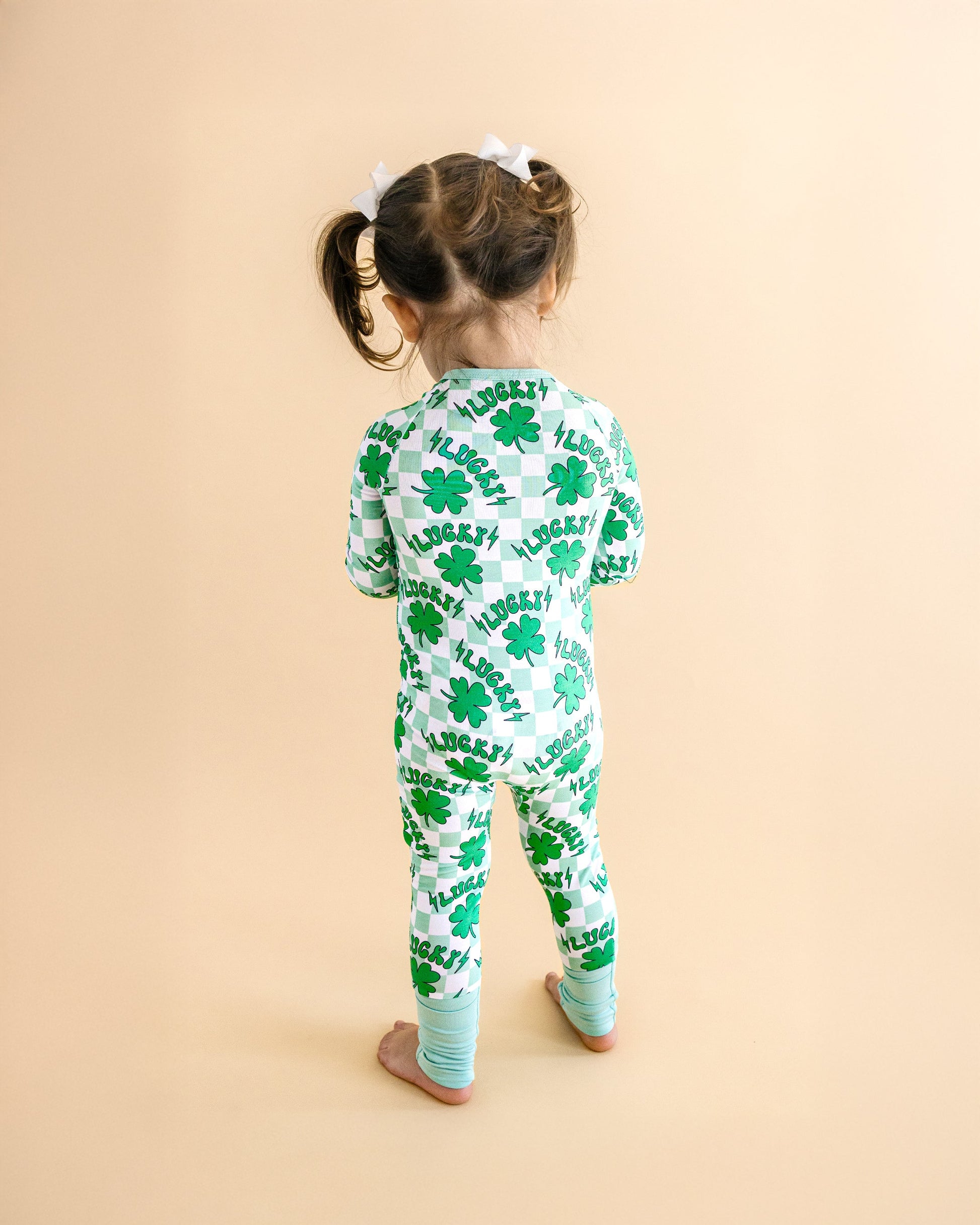 Lucky never looked so cute! Super-soft + stretchy, featuring fold-over mittens + footies up to 18-24M. Diaper changes are a breeze with the two-way zipper. Your little one will stay cozy + comfortable, whether it's playtime, nap time, or cuddle time.