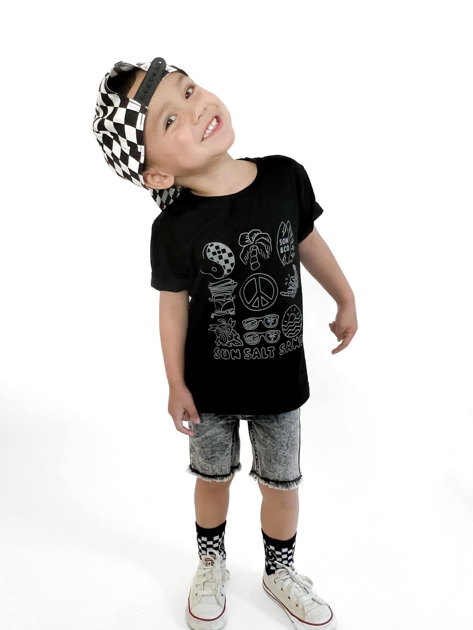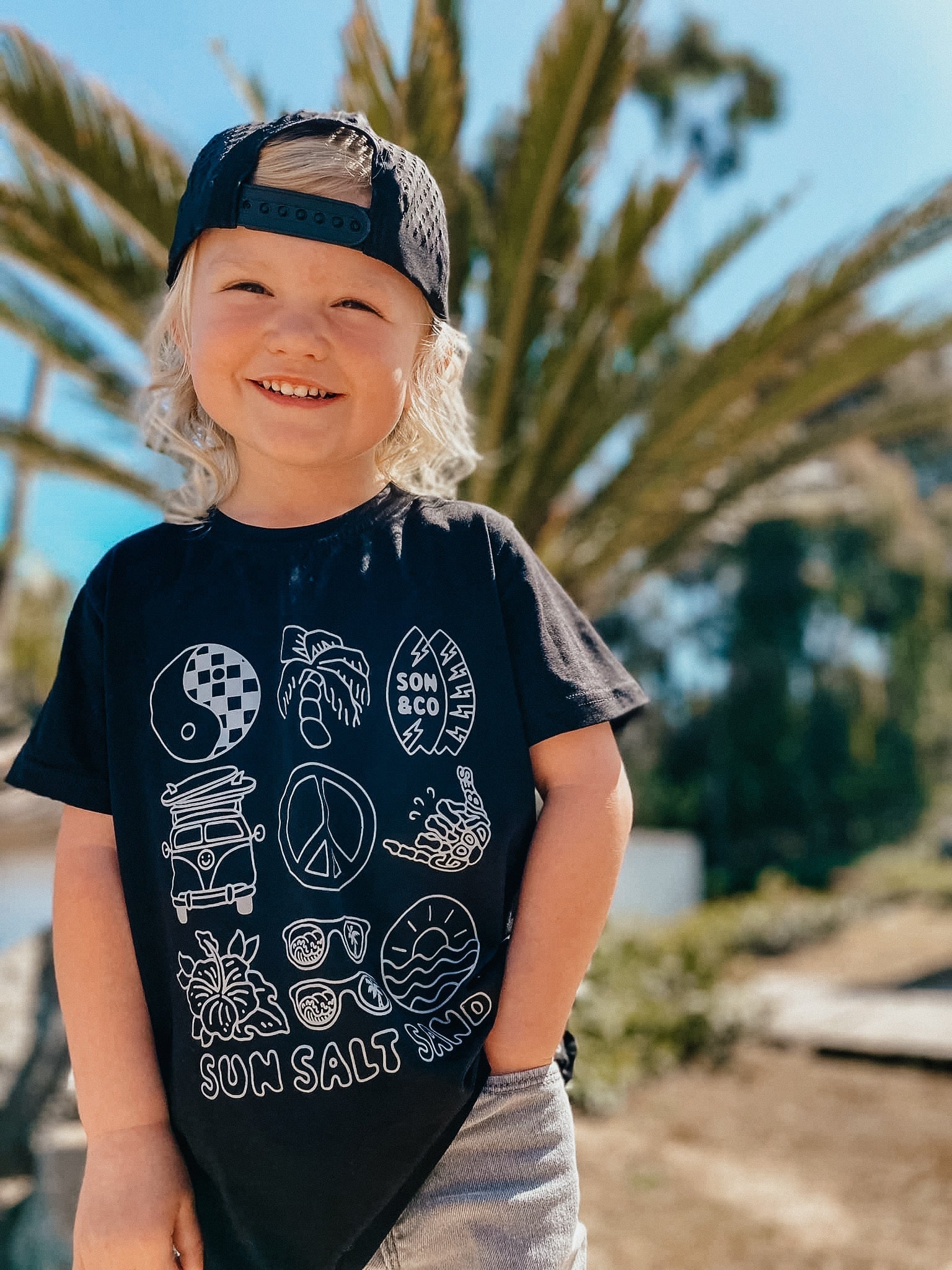For the ultimate beach-ready outfit, pair the Beach Daze T-Shirt with our Happy Shores Swim Trunks. This combination is not just about looking good; it's about making memories in comfort + style. Together, they create a cohesive look that's as playful + free-spirited as the kids who wear them. Whether it's for a day at the beach, a pool party, or a casual day out, this pairing ensures your child stands out while embracing the joy + freedom of summer.