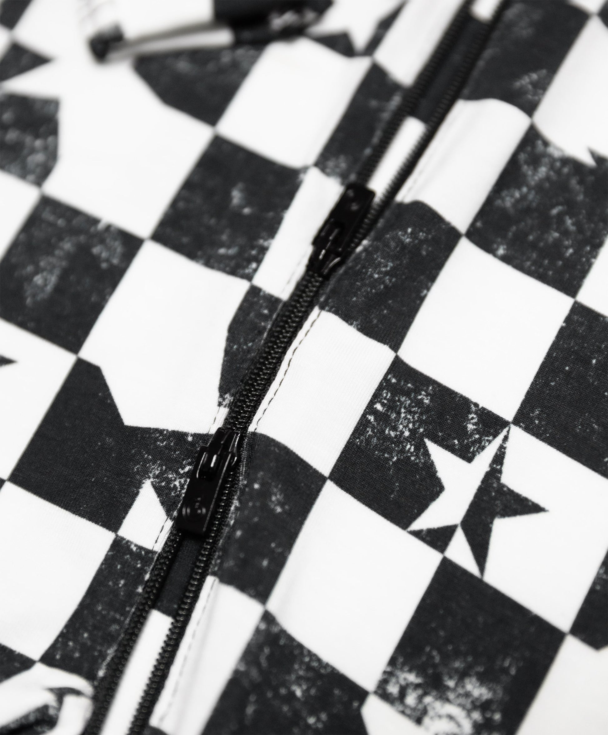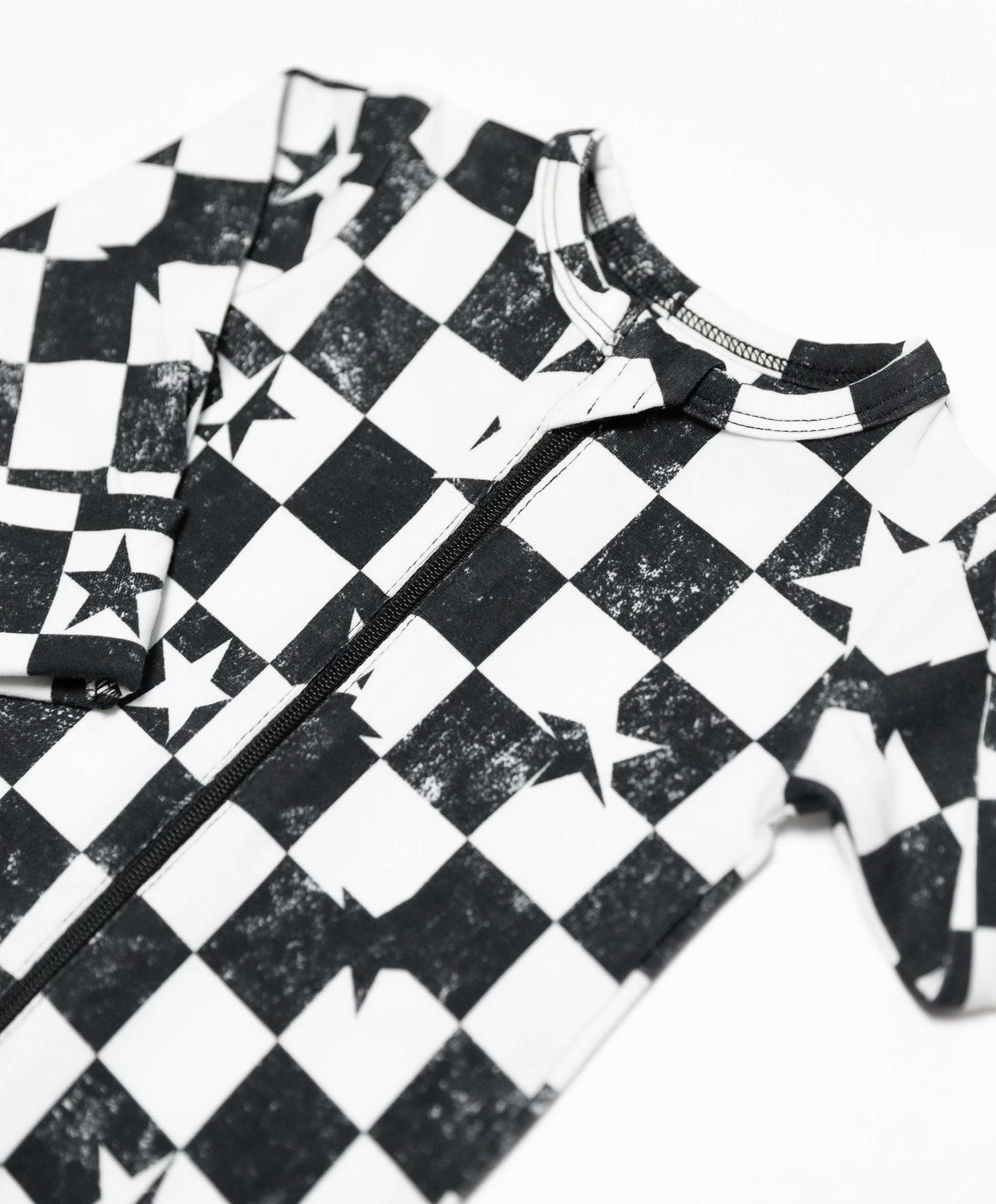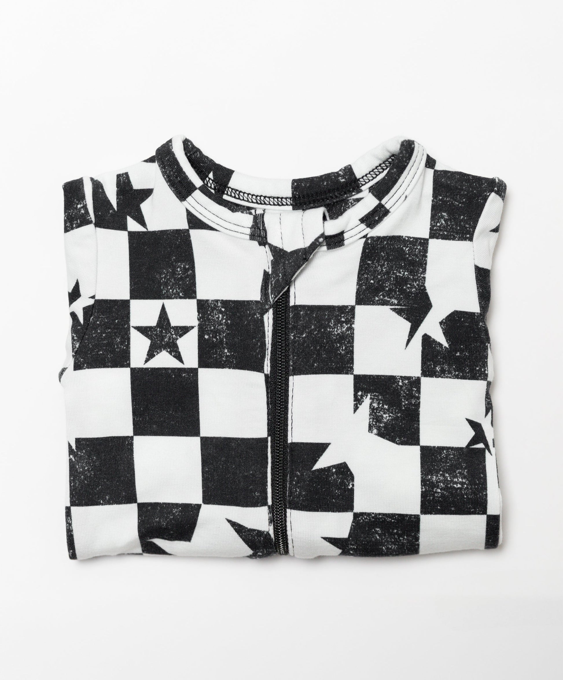 A timeless classic with a bold, modern edge. The Black + White Checkered Star print takes the iconic checkerboard pattern + gives it a playful, starry twist. Crisp black + white with a distressed, worn-in look, this LUXIE® is both nostalgic + effortlessly cool. Made from our signature Bamboo + Pima Cotton blend, it’s the ultimate mix of softness + breathability. With mitten + footie cuffs for a cozy fit + a two-way zipper for easy changes, this set is a must-have for your little rockstar.