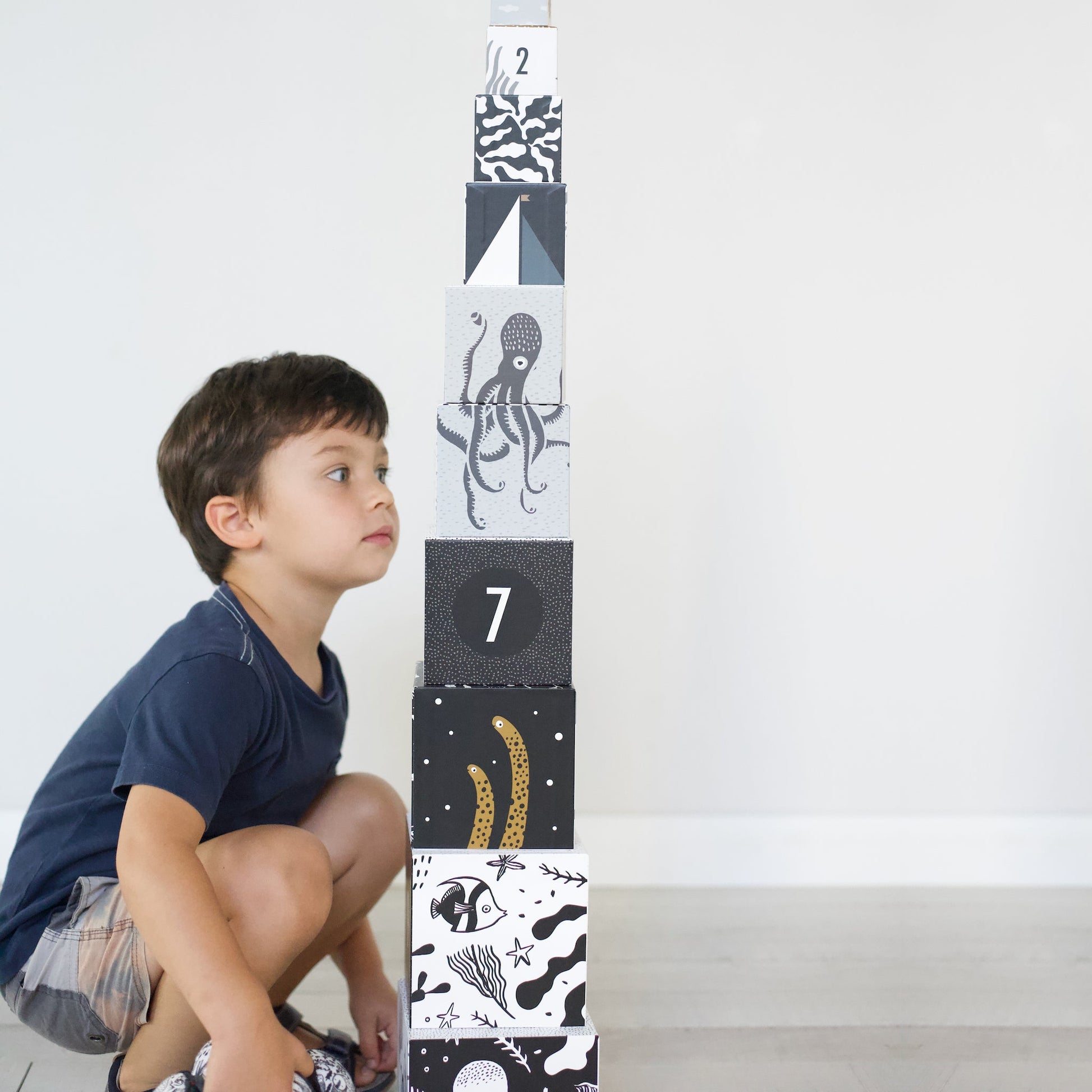 The Nesting Blocks feature charming ocean creatures, inviting little ones to stack + play while exploring numbers + counting. With ten blocks in varying sizes, children can learn numbers one through ten as they stack + nest them back together, fostering early math skills + cognitive development. The high-contrast patterns + illustrations provide sensory stimulation + endless entertainment. See how high you can stack these versatile blocks!