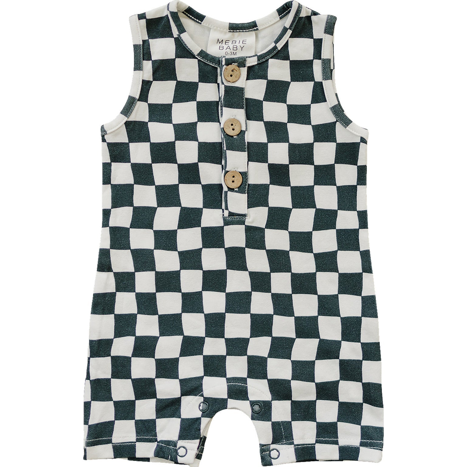 Get ready for sunny days with this stylish charcoal wavy checkered short romper! The fresh pattern adds a touch of fun, while the relaxed fit + sleeveless + shorts design make it perfect for keeping cool on hot summer days. Whether they’re running around the playground or enjoying a family day out, this romper is as comfy as it is cute, making it a must-have for any little one. They have wood buttons on the front that + such a cute detail. We also added snaps on the bottom for easy diaper changes!
