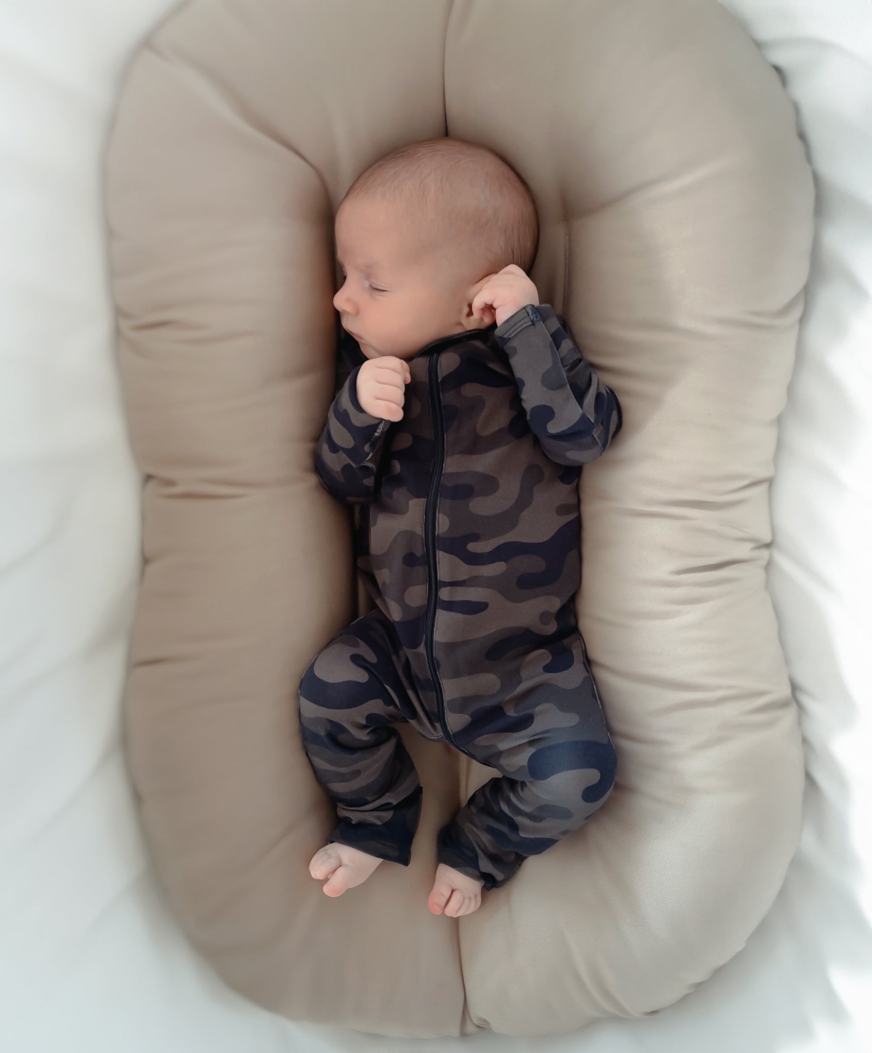 Dark Camo LUXIE® — the perfect fusion of fashion and coziness for your little one. All sizes come with adaptable mitten and footie cuffs, providing a snug fit for both play and sleep. Our specially-developed custom blend of Bamboo and Pima Cotton results in an incredibly soft, stretchy, and breathable fabric that your child will adore. The foldable cuffs supply extra warmth and shield against fingernail scratches, making this outfit the ideal all-encompassing solution for your baby's necessities. Experience the unparalleled comfort of the LUXIE® and delight in your little one's enjoyment.
