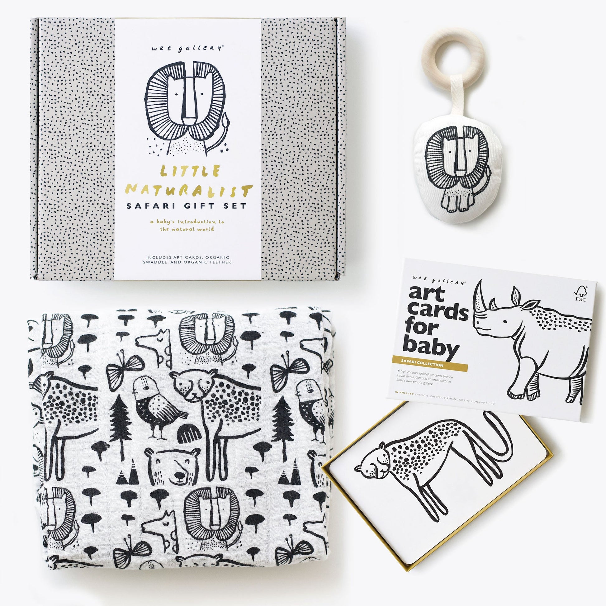 Our Little Naturalist Gift Set for newborns features some of our most popular toys + is sure to bring giggles + smiles from your little loved one! We have paired our Organic Lion Teether, our top selling Art Cards + our Organic Cotton Muslin Swaddle. These high-contrast toys are designed to stimulate baby's senses + to elicit joy + wonder. They are developmentally appropriate from birth to eighteen months, so they will grow with baby.