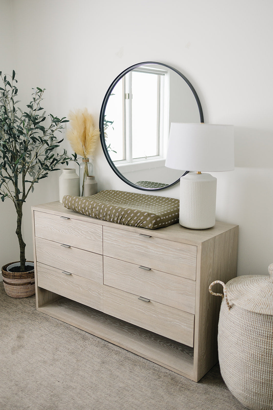 Transform your baby's changing area with our Olive Strokes Muslin Changing Pad Cover. Crafted from our exclusive designed fabric, this cover is not only soft + breathable but also easy to wash. The elasticized edges make it a breeze to put on + take off standard changing pads.