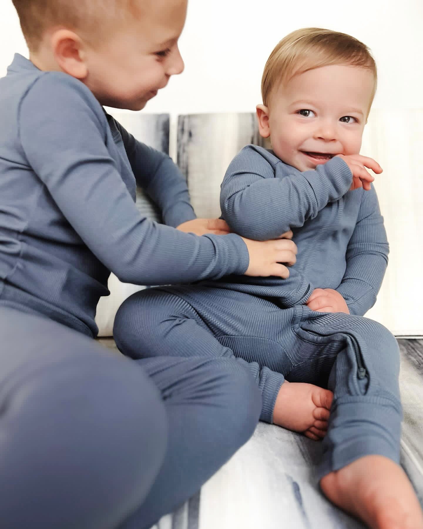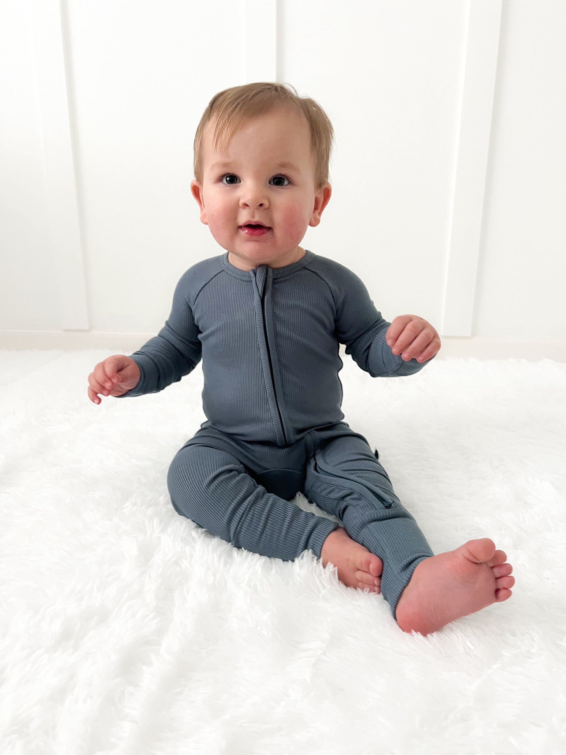 The ribbed collection is made with a premium ribbed bamboo blend + just as buttery soft as our classic fabric. They feature fold over cuffs to protect those tiny hands + feet, a double zipper for easy diaper changes, + printed tags to avoid irritation. The durability + stretchiness of this fabric will ensure they last 3 times longer than traditional cotton pjs